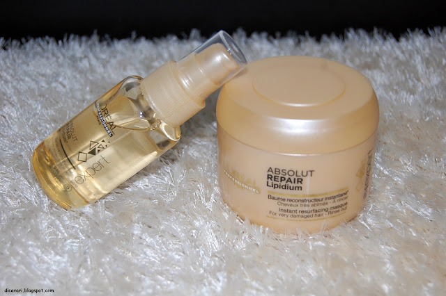 Em Maio decidi cortar "as pontas do cabelo", o meu cabelo estava muito abaixo do peito e percebi que o repicado nas pontas não dá para mim a juntar a três camadas de escadeado ainda abre mais a ponta do fio capilar, originando as Pontas duplas. Farta disso decidi ir comprar o Absolut Repair da L'oréal (marca que a minha mãe adora e fui por indicação dela). Comprei somente dois produtos a máscara e o sérum, não vi necessidade de comprar a gama toda, tendo champô e amaciador em casa que funciona bem no meu cabelo.