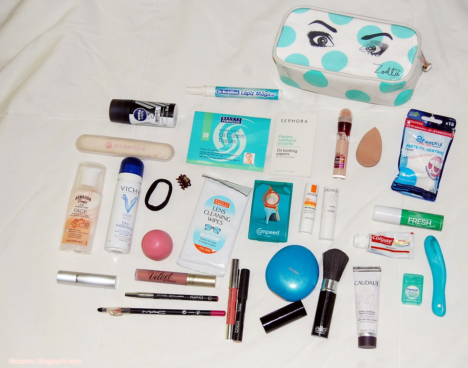 Toda uma panóplia de produtos de mulher, como podem ver não há muita maquilhagem isto porque maquilho-me em casa, acho que a minha necessaire no fundo é cheia de inutilidades.